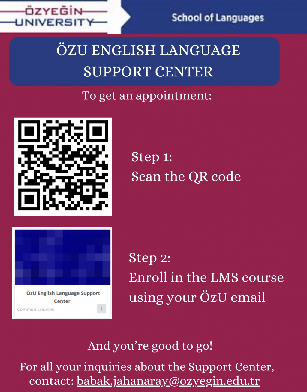 Study Center and Speaking Center, two of the centers serving within ÖzU English Language Support Center, aim to support and guide all students registered in the Preparatory Program and departments with their English skills outside class hours. In order to improve themselves in the areas they need (reading, listening, writing, speaking, grammar, vocabulary, and study skills), students can make an appointment with the instructors working in these centers and meet face-to-face, using the Support Center poster provided.